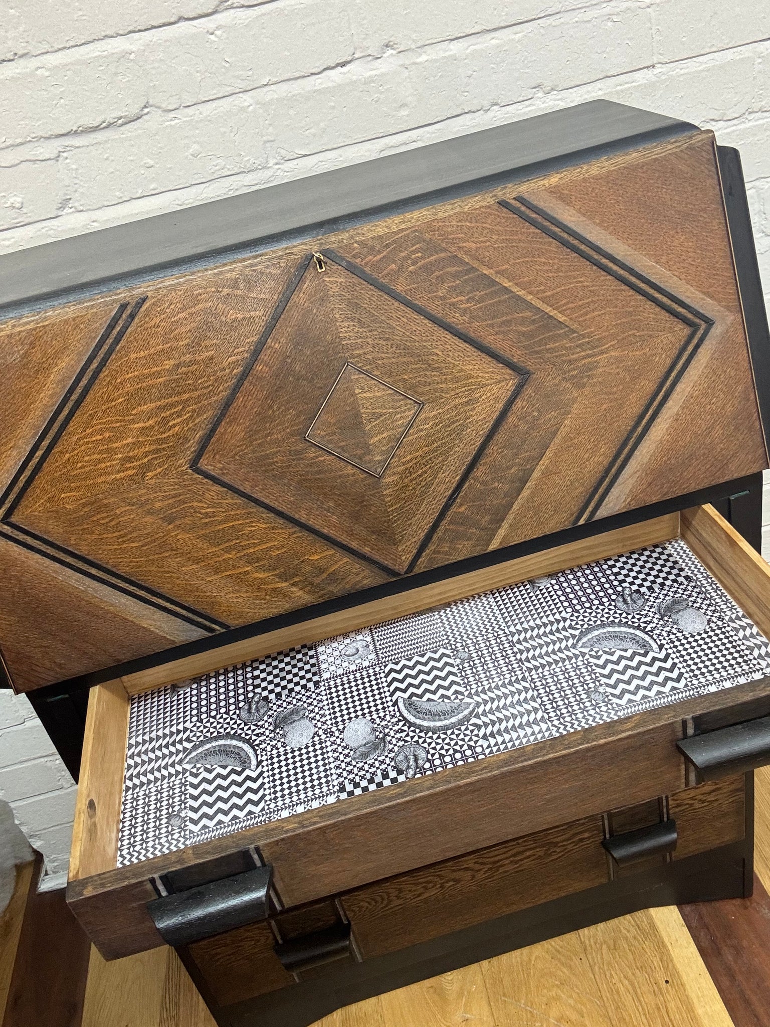 This beautifully reimagined Art Deco bureau has been carefully restored in the Colour Me KT workshop to celebrate the craftsmanship and detail of its original marquetry design.